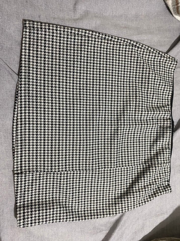 Gri ekose desenli, pilili ve sentetik kumaştan yapılmış, ofis için uygun, fitted midi boy etek.