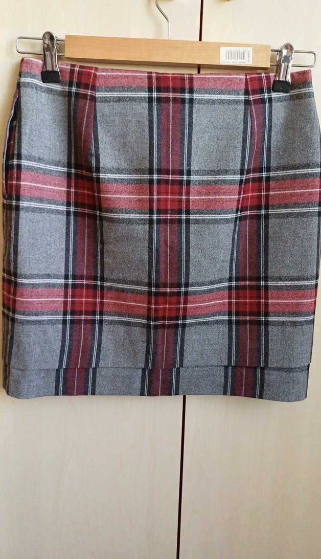 Gri renkte, ekose desenli ve pilili midi uzunlukta kadın eteği. Yumuşak kaşe kumaştan, ofis için uygun, regular fit.
