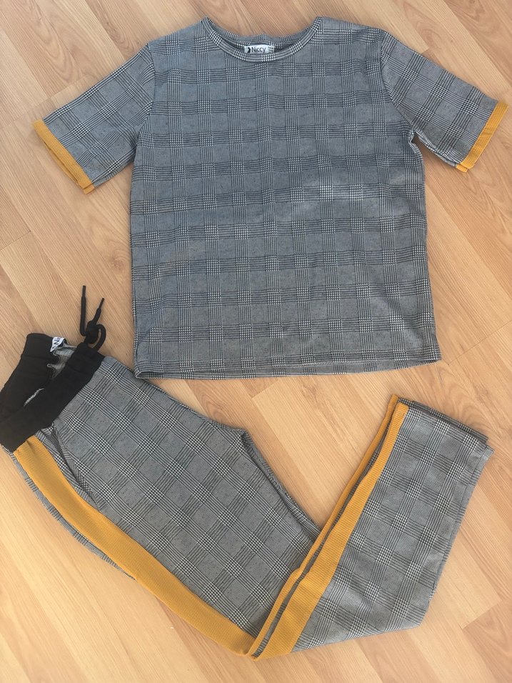 gri ekose desenli, regular fit, bisiklet yaka ve sarı detaylı rahat bir eşofman takımı.