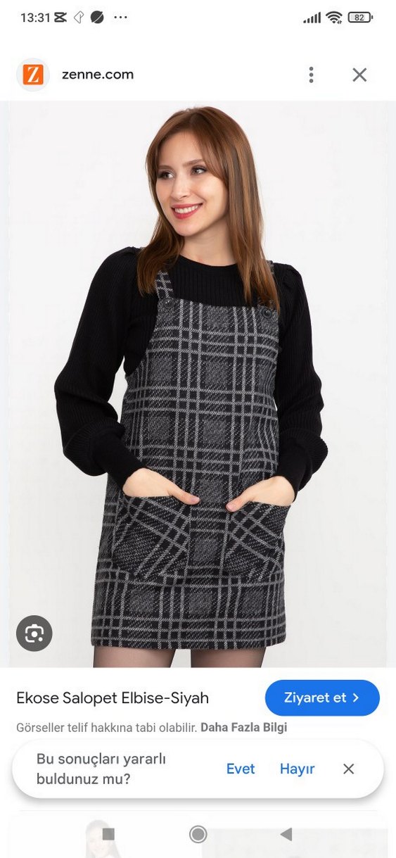 Gri ekose desenli, uzun kollu, salaş kesim midi triko salopet elbise, günlük ve sokak stiline uygun.