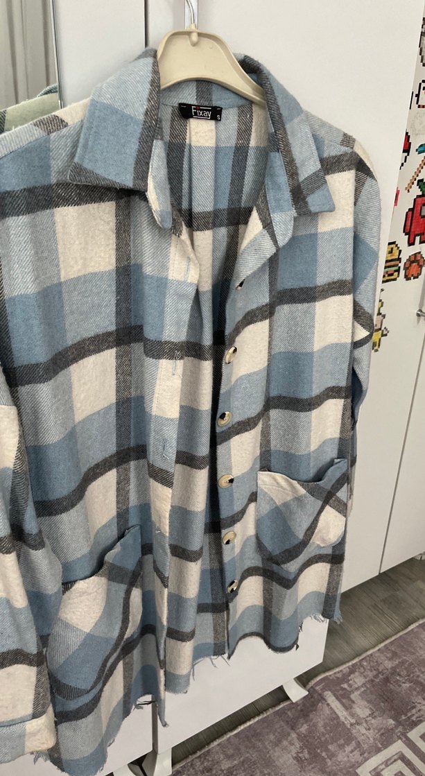 Düğmeli önü ve kesimli yakası olan gri ekose desenli, uzun kollu, bol kesim kadın gömleği. Yumuşak dokulu ve günlük rahat stil için uygundur.