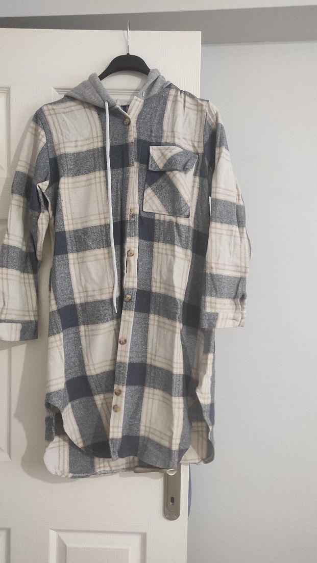 Gri ekose desenli, düğmeli, uzun kollu ve yakalı pamuk gömlek. Salaş kesimi ve midi boyu ile rahat bir günlük stil sunar. ️