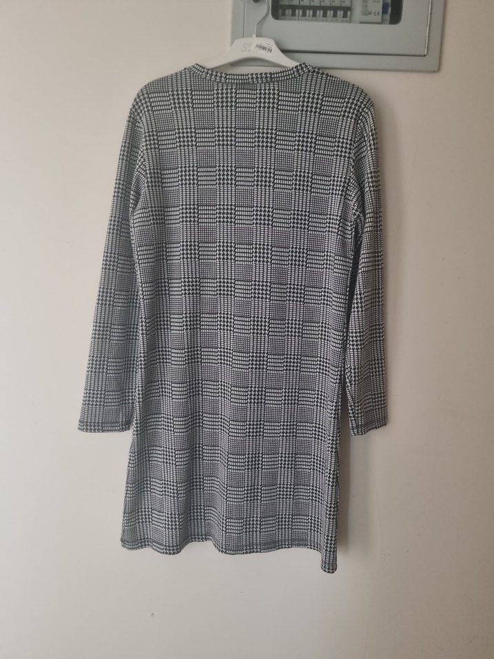 Gri ekose desenli triko elbise, uzun kollu ve bisiklet yaka. Düğmeli detaylarla sade ve rahat bir görünüm sunar.