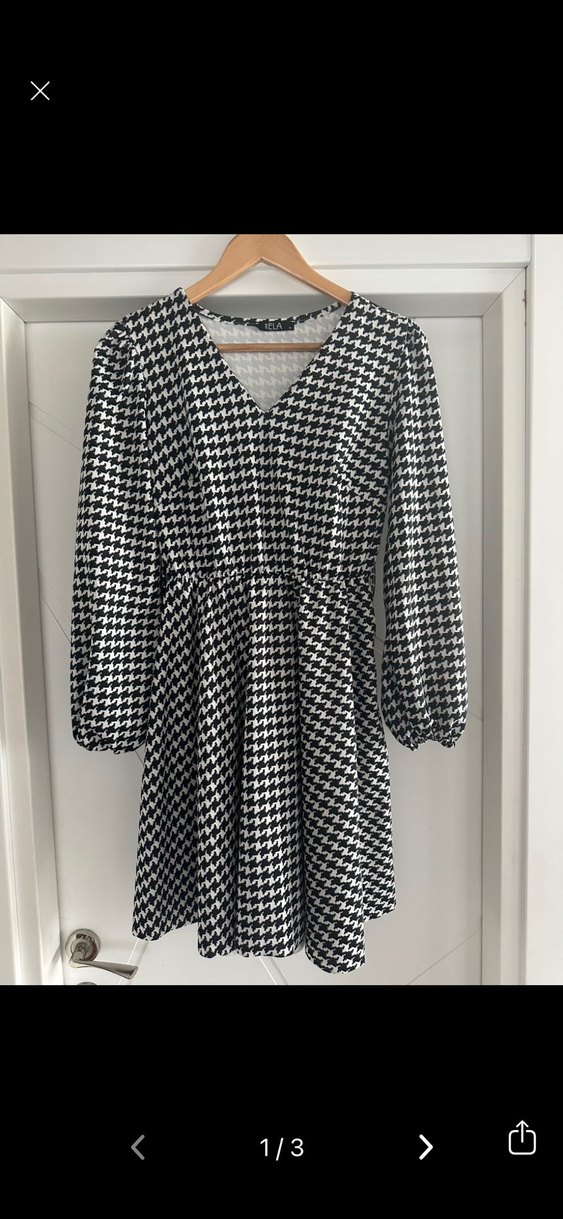 Gri ekose desenli, uzun kollu ve pileli, bol kesim V yaka midi elbisedir. Ofis ve günlük sokak stiline uygundur.