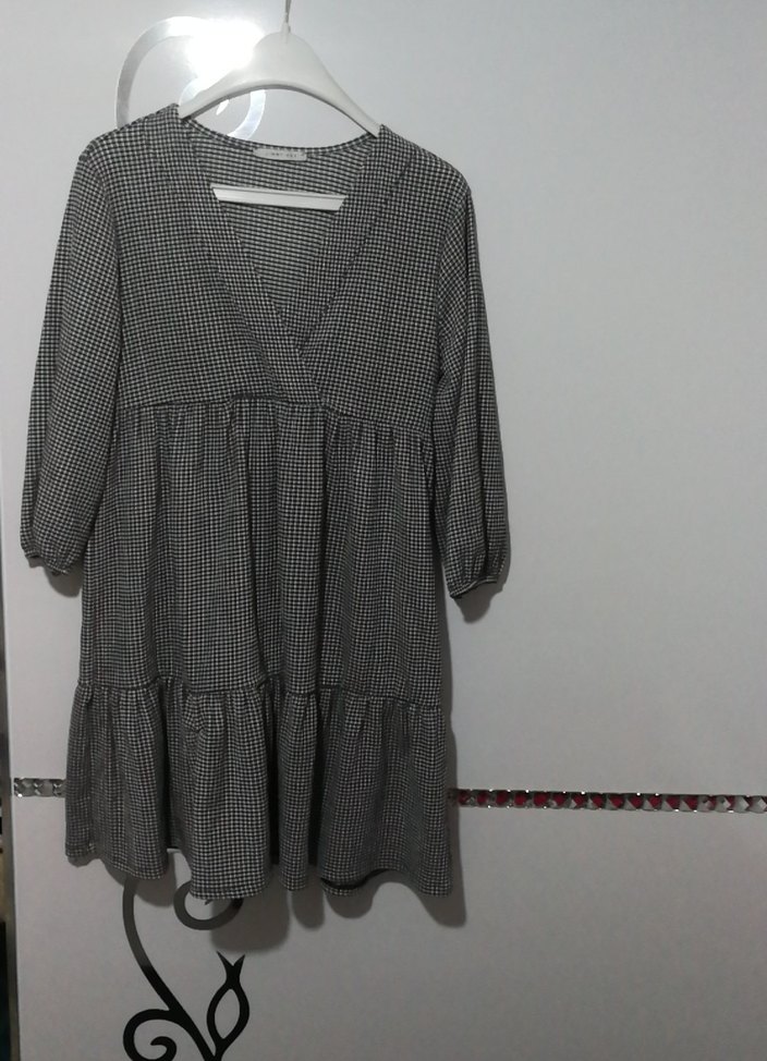 V yaka, fırfır detaylı, bol kesim gri ekose midi elbise, nefes alabilir kumaştan üretilmiştir. Günlük kullanıma uygundur.