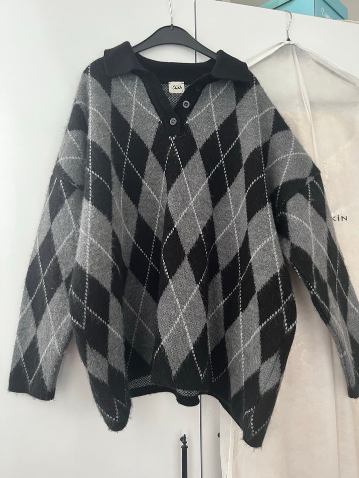 Gri renkli, ekose desenli örgü kazak. V yaka, uzun kollu ve bol kesimdir. Midi boyda, rahat sokak stili için uygundur.