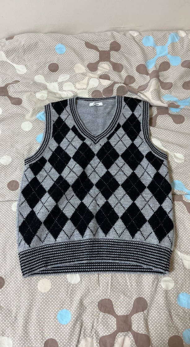 Gri ekose desenli, V yaka ve kolsuz örme süveter, rahat ve salaş kesimiyle günlük sokak stili için uygundur.