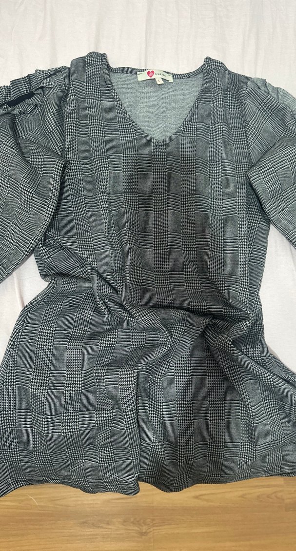 Koton L Beden Gri ekose desenli, V yaka ve pilili detaylı uzun kollu tunik. Normal kesim ve midi boyda, yumuşak sentetik kumaştan, günlük sokak tarzı için uygundur.