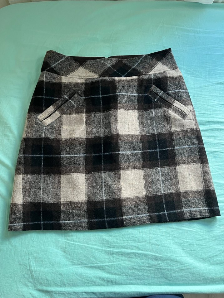 gri tonlarında ekose desenli, yün kumaştan yapılmış, cep detaylı