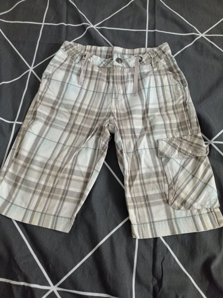 Gri ekoseli, kemerli, sentetik kumaştan erkek çocuk şort. Bol kesim ve rahat dış mekan kullanımı için uygundur.