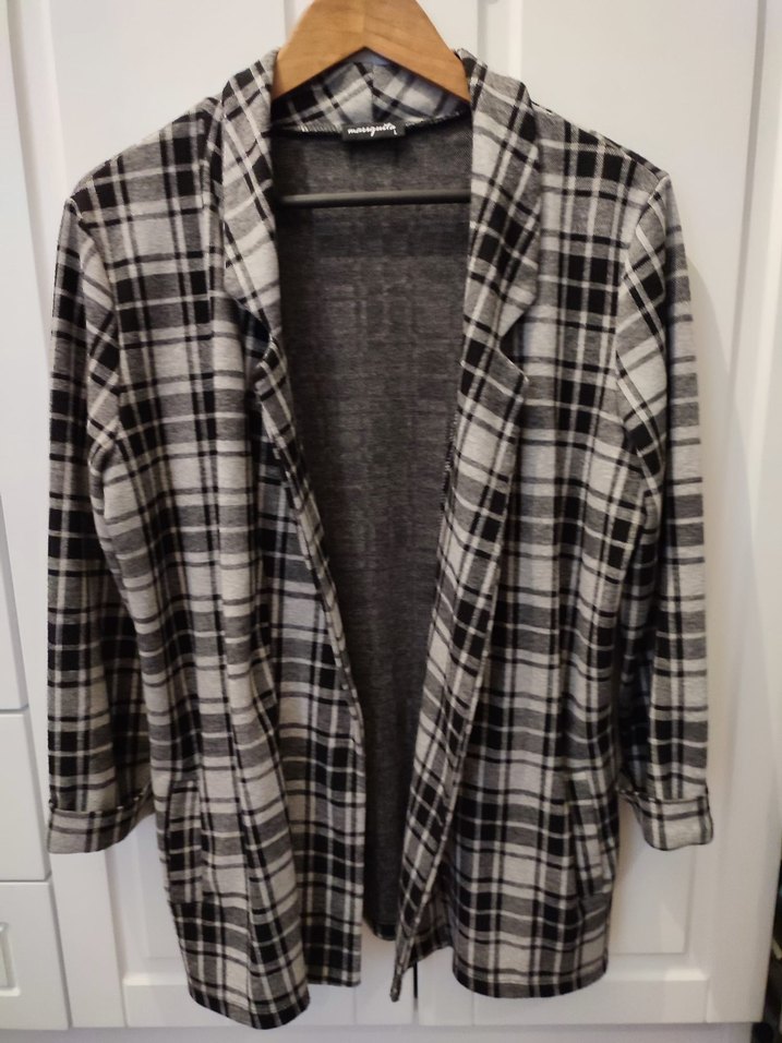 Gri ekoseli blazer ceket, normal midi boydadır. Yumuşak ve sıcak kumaştan üretilmiştir, rahat bir kesime sahiptir.Çok az kullanıldı.