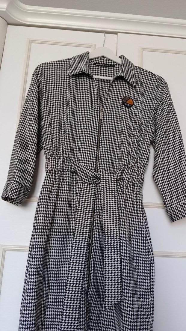 Gri ekoseli, boydan fermuarlı, kendinden kuşaklı,beli lastikli düz üstü elbise