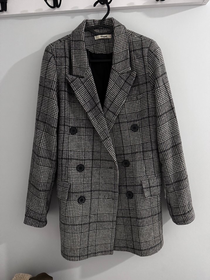 Gri ekoseli, düğmeli, normal uzunlukta kadın ceket. Notch yaka ve uzun kolludur, iş yeri için uygundur. Sentetik kumaş hissi verir.