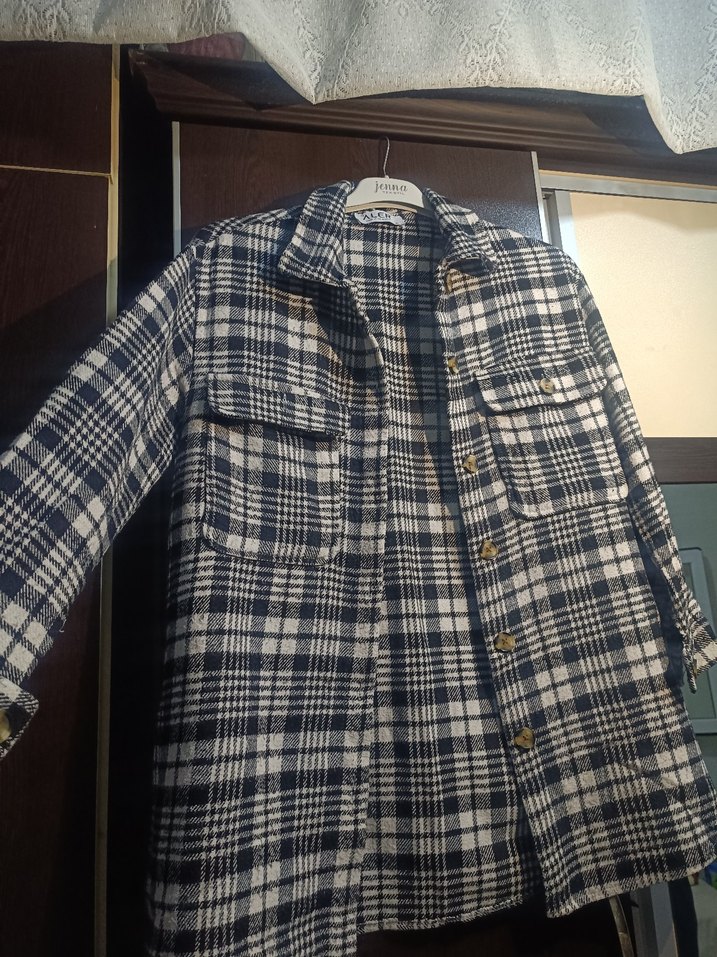 Gri ekoseli, düğmeli kadın gömleği, yün kumaştan, uzun kollu ve rahat kesimlidir. Normal midi boyu ile günlük sokak stiline uygundur.