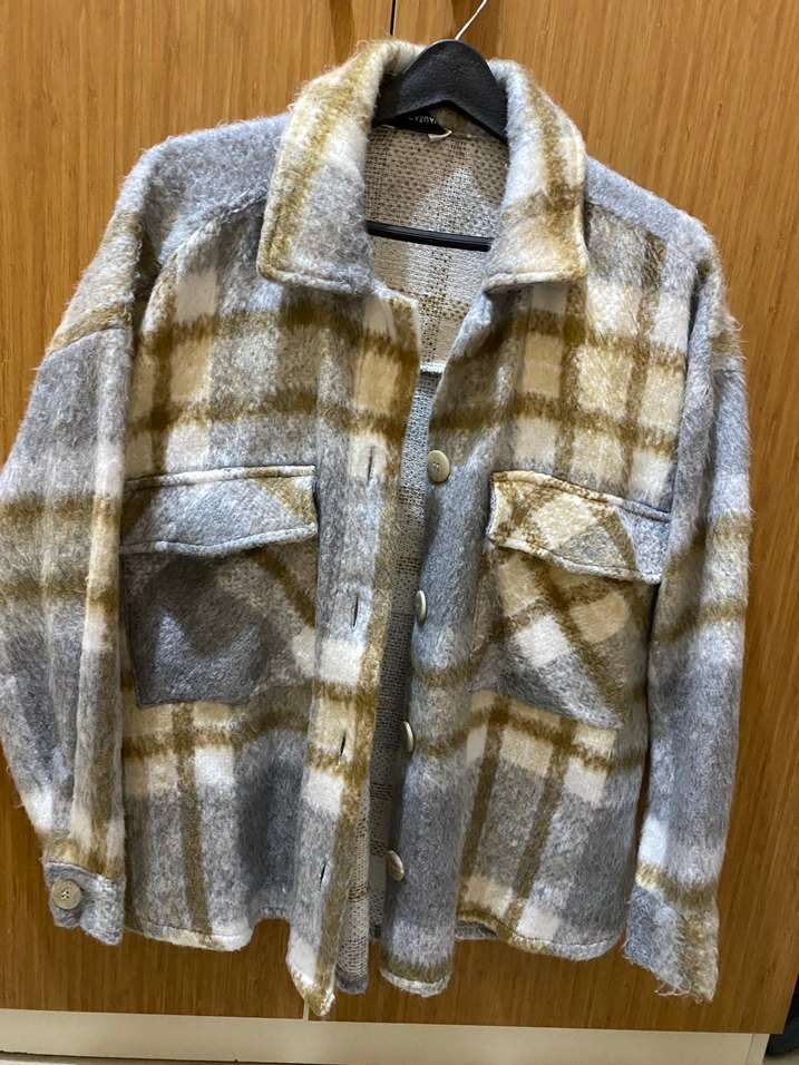 Gri ve bej ekoseli, düğmeli, uzun kollu, yumuşak ve sıcak kumaştan kadın gömlek. Rahat kesimi ve iki cepli, günlük sokak tarzı için uygundur.