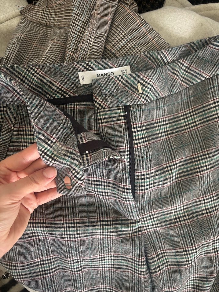 Gri ekoseli kumaş pantolon, düğmeli, normal boy ve regular fit. Günlük ve sokak stiline uygun.