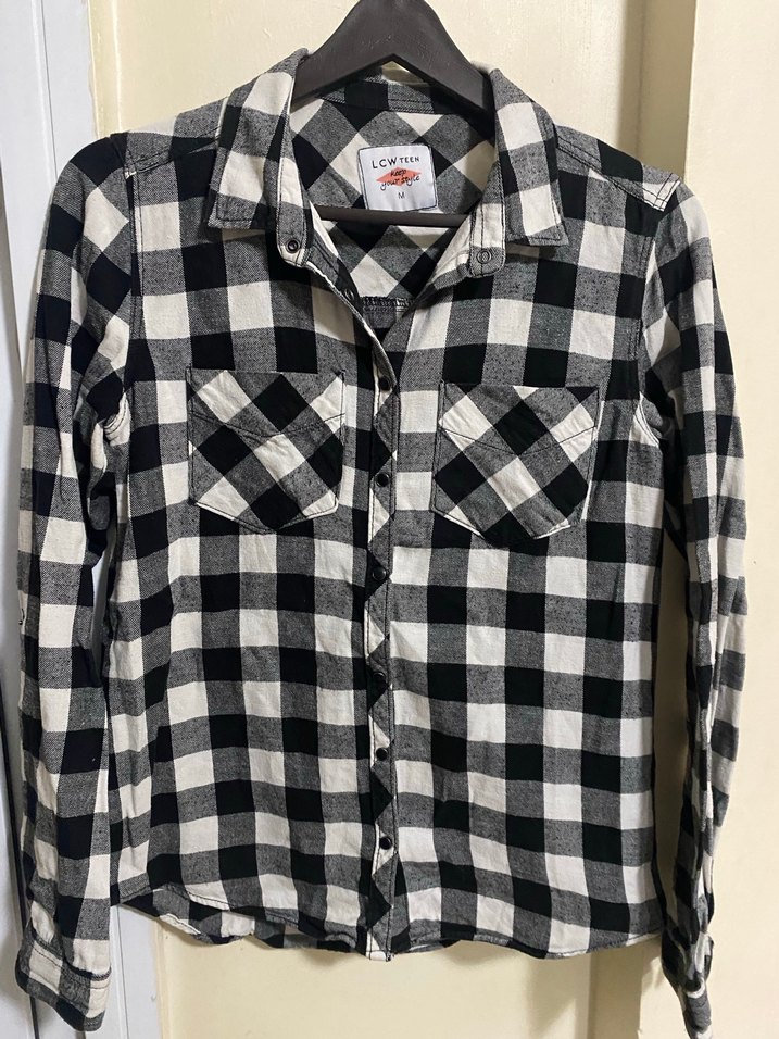 Pamuklu, gri ekoseli, düğmeli, uzun kollu, notched lapel yakalı, bol kesim kadın gömlek. Günlük sokak stili için uygundur.
