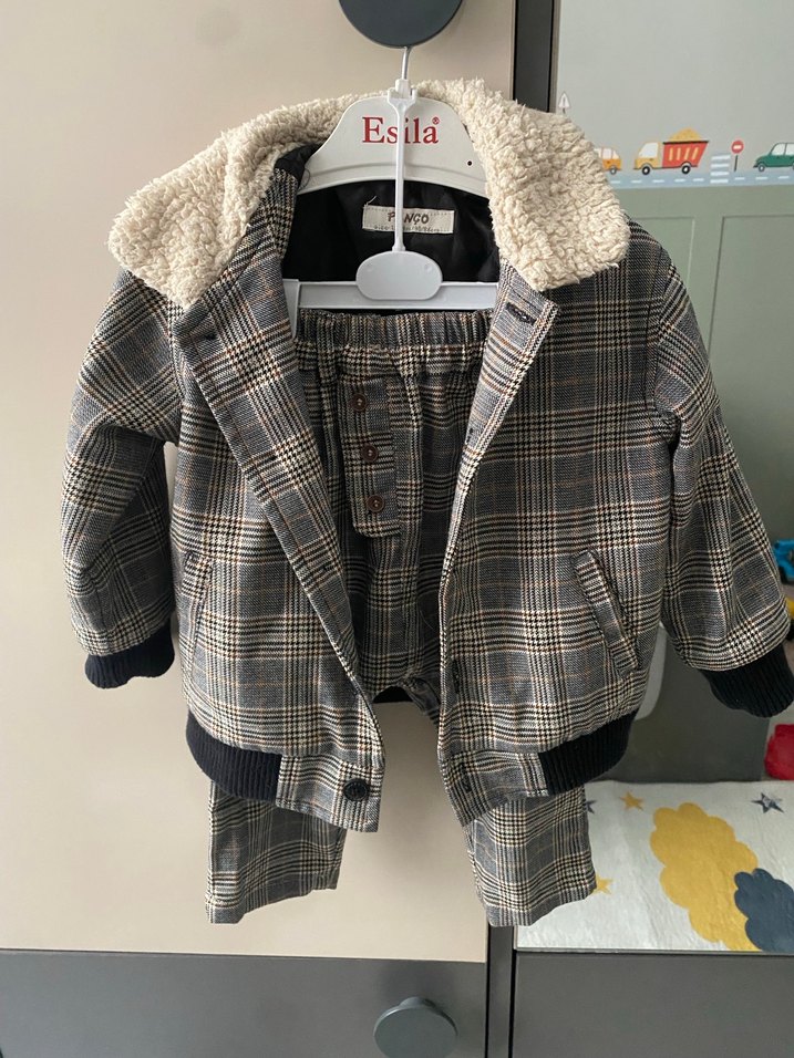 Gri ekoseli, düğmeli ve notched lapel yakalı erkek çocuk kabanı. Yumuşak ve sıcak fleece kumaştan, rahat ve trend sokak stili için uygundur. Tek tek de isteyen olursa satabılırım. Ikılı fiyatıdır.