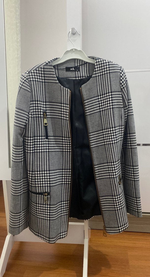 Gri ekoseli, fermuarlı, uzun kollu, midi boy kadın blazer. Normal kesim ve yakalı, sentetik kumaştan, günlük rahat kullanıma uygun.