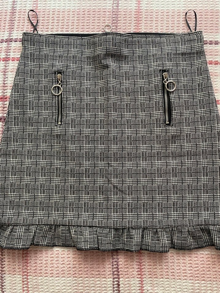 Gri ekoseli mini etek, fırfır detaylı ve fermuarlı ceplerle, yumuşak sentetik kumaştan üretilmiştir. Sokak stiline uygun.