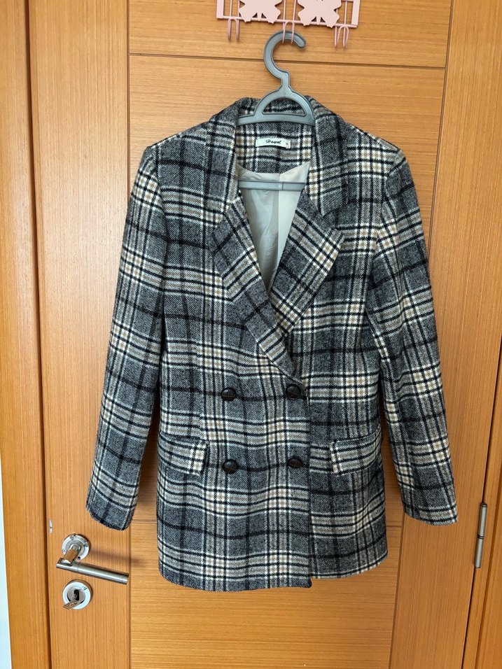 Gri ekoseli, çıtçıtlı, uzun kollu, normal boy midi kadın blazer ceket. Ofis ve trend sokak stiline uygun rahat kesim.Astarlıdır.