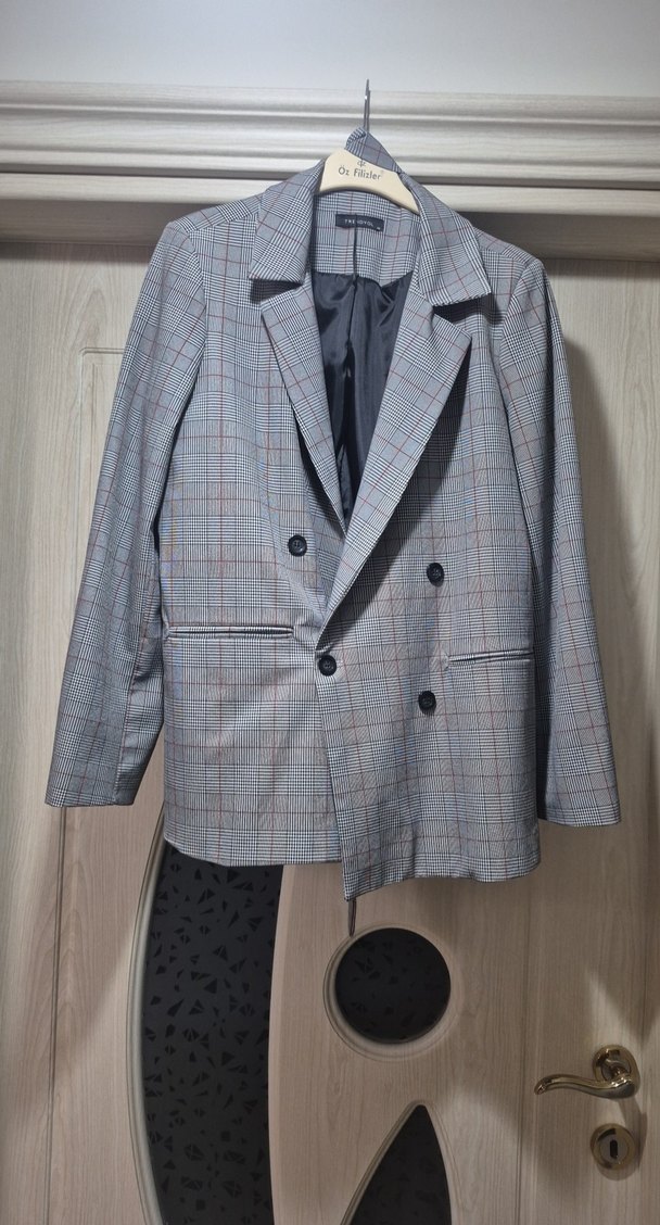 Gri ekoseli, düğmeli ve kesimli yaka detaylı, ofis ve günlük kullanıma uygun kadın blazer ceket.