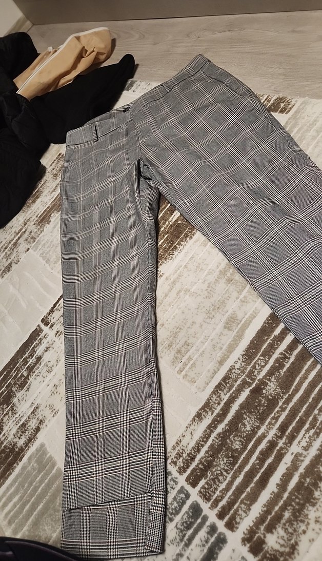 Gri ekoseli kumaş pantolonlar, midi boyda, paça modelli, düzenli kesimlidir. Ofis için uygun, sokak stili ve iş tarzını birleştirir. bana bol geldiği için satıyorum temiz durumda alacak olan pişman olmaz şimdiden güle güle kullanılsın.