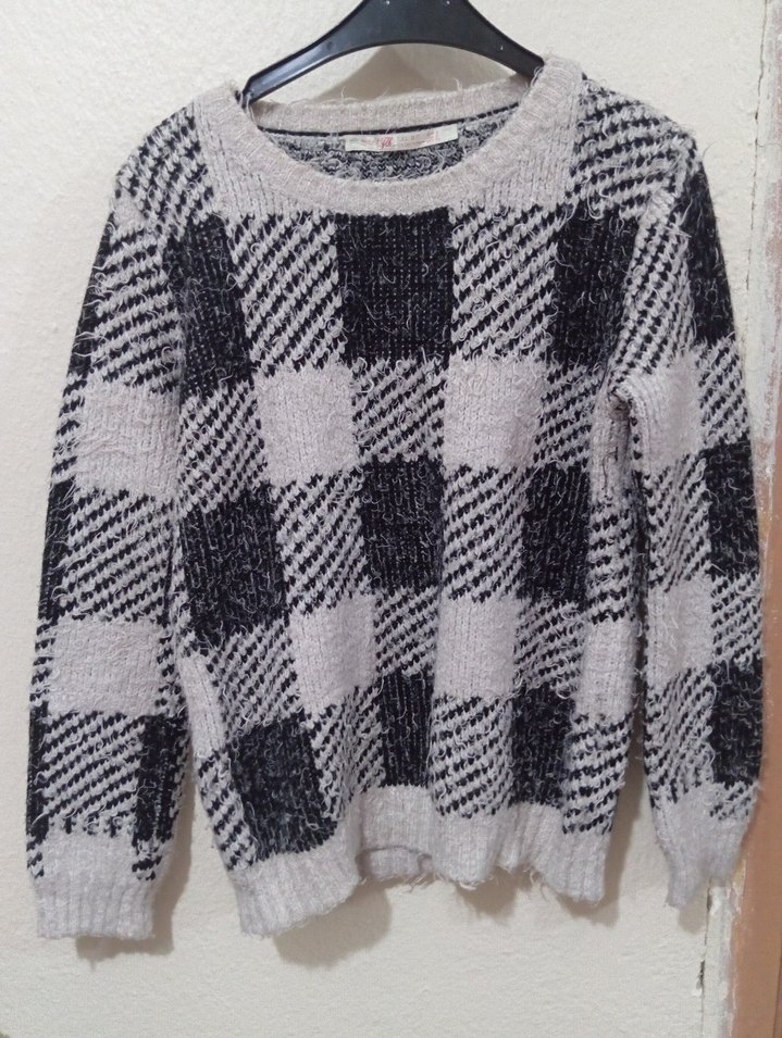 Gri ekoseli, uzun kollu, yuvarlak yaka ve bol kesim kadın örgü kazak, günlük kullanıma uygun rahat bir modeldir.