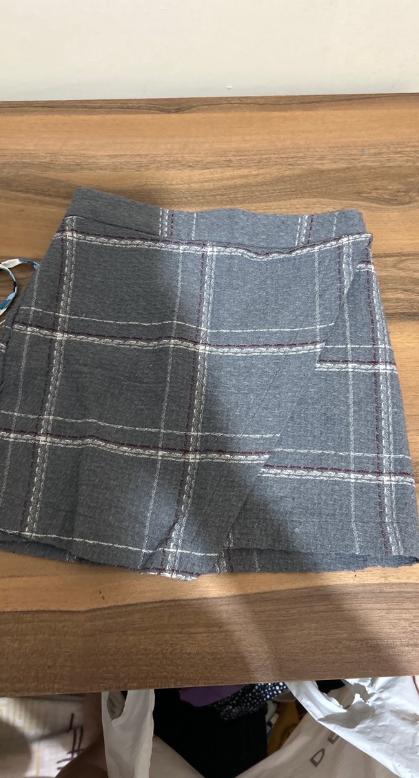 Gri ekoseli mini etek, kemerli ve bol kesimdir. Yumuşak sentetik kumaştan yapılmıştır, günlük sokak stili için uygundur.