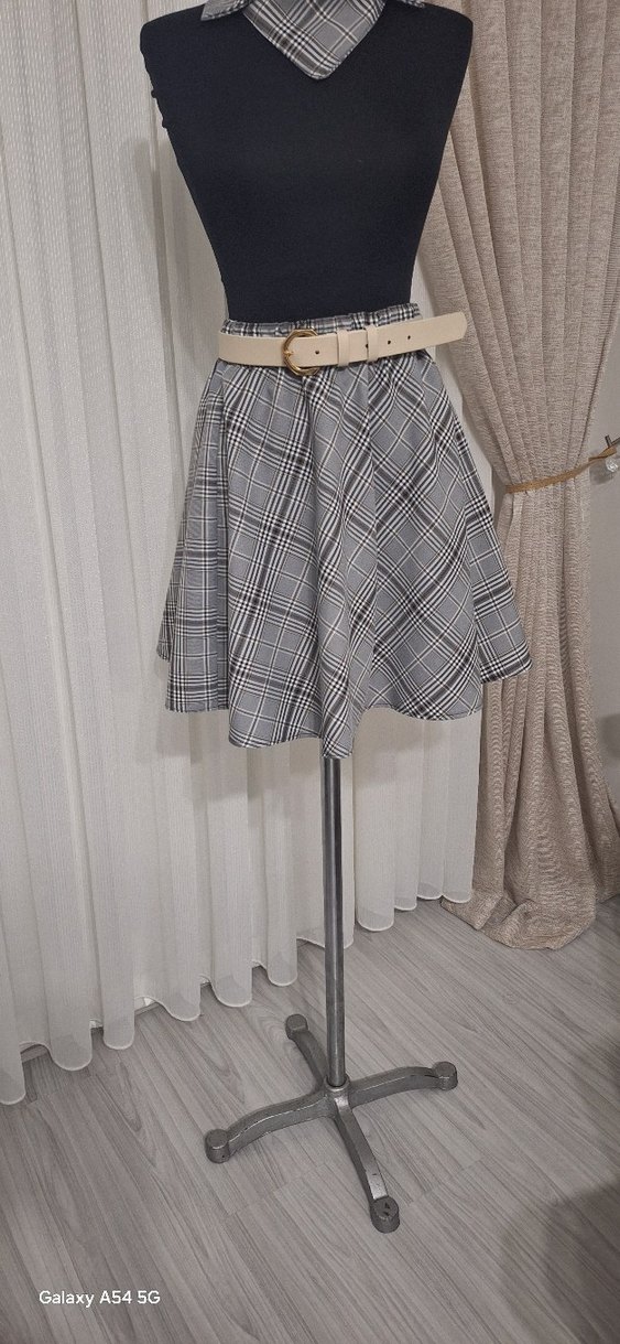 Gri ekoseli mini etek, kemer dekor amacli .49 santim uzunluta beli lastikli