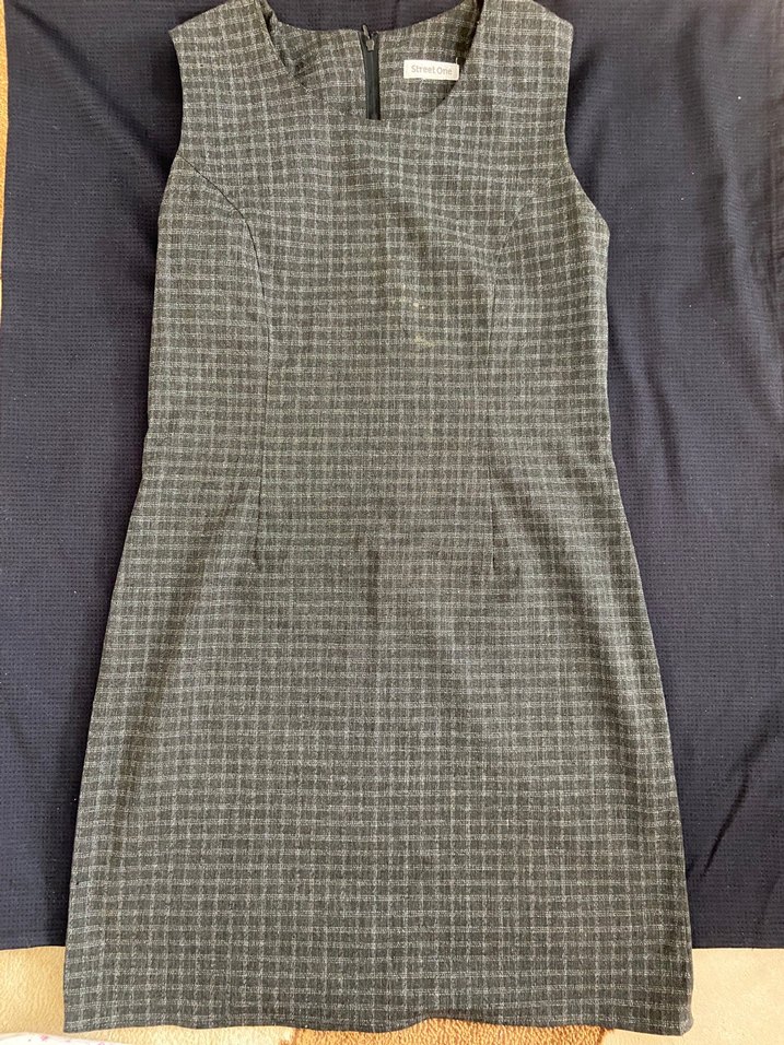 Kolsuz, bisiklet yaka, gri ekoseli elbise. Yumuşak sentetik kumaştan, ofis için uygun normal kesim.