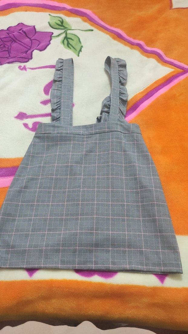 Gri ekoseli ve fırfırlı askılı jile, şık ve kullanışlıdır.