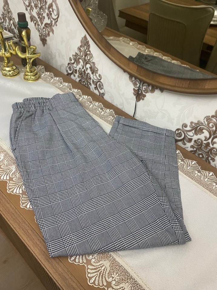 Gri ekoseli pamuk kumaştan, piliseli detaylı, midi boy, rahat kesim kadın pantolon. Günlük kullanıma uygun, sokak modasına uyumlu.