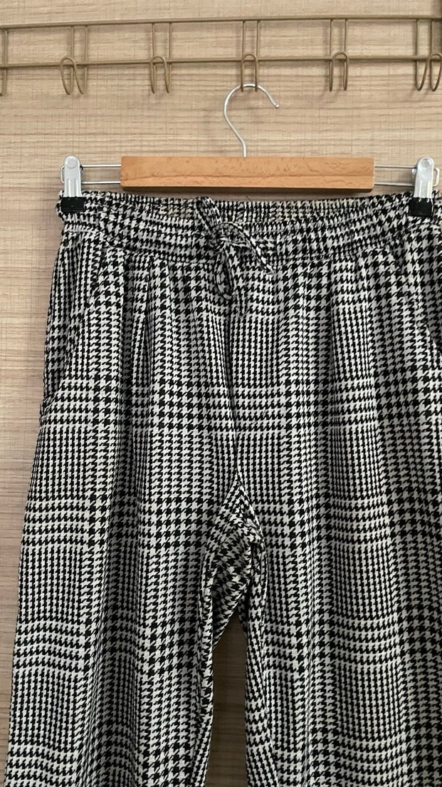 Gri ekoseli, sentetik kumaştan, bol kesim ve pileli kadın pantolonudur. Midi boyda ve günlük kullanım için uygundur.