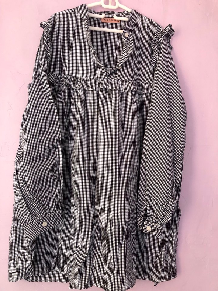 Gri ekoseli, uzun kollu, V yakalı, gömlek Nefes alan keten kumaştan, günlük rahat kullanım için uygun.