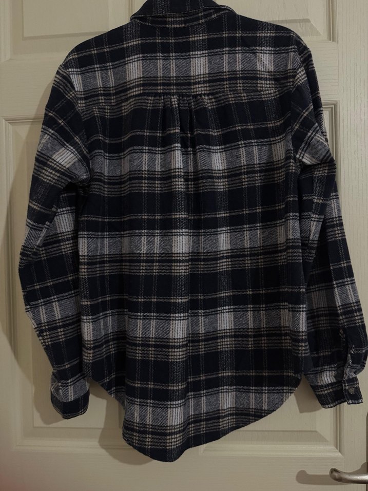 Gri ekoseli, düğmeli ve uzun kollu, pamuklu kumaştan yapılmış bol kesim kadın gömleği. Rahat ve günlük kullanıma uygundur.