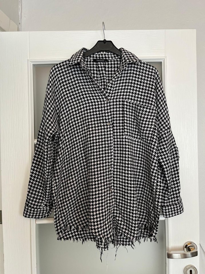 Gri ekoseli kadın gömlek, uzun kollu ve kesik yakalıdır. Keten kumaştan, düğmeli ve midi boydadır. Salaş kesimi ve yıpranmış etek ucu ile sokak stiline uygundur. temiz ve hasarsizdir.
