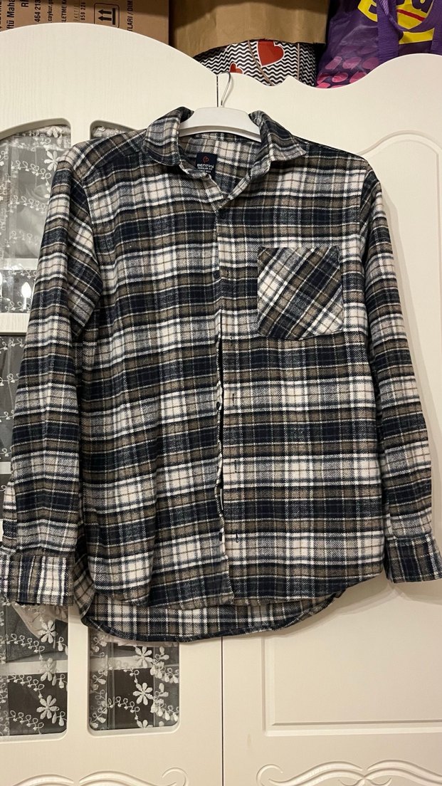Gri ekoseli, düğmeli, uzun kollu, yakalı, bol kesim kadın gömlek. Yumuşak dokulu kumaştan, günlük rahat kullanım için uygundur.