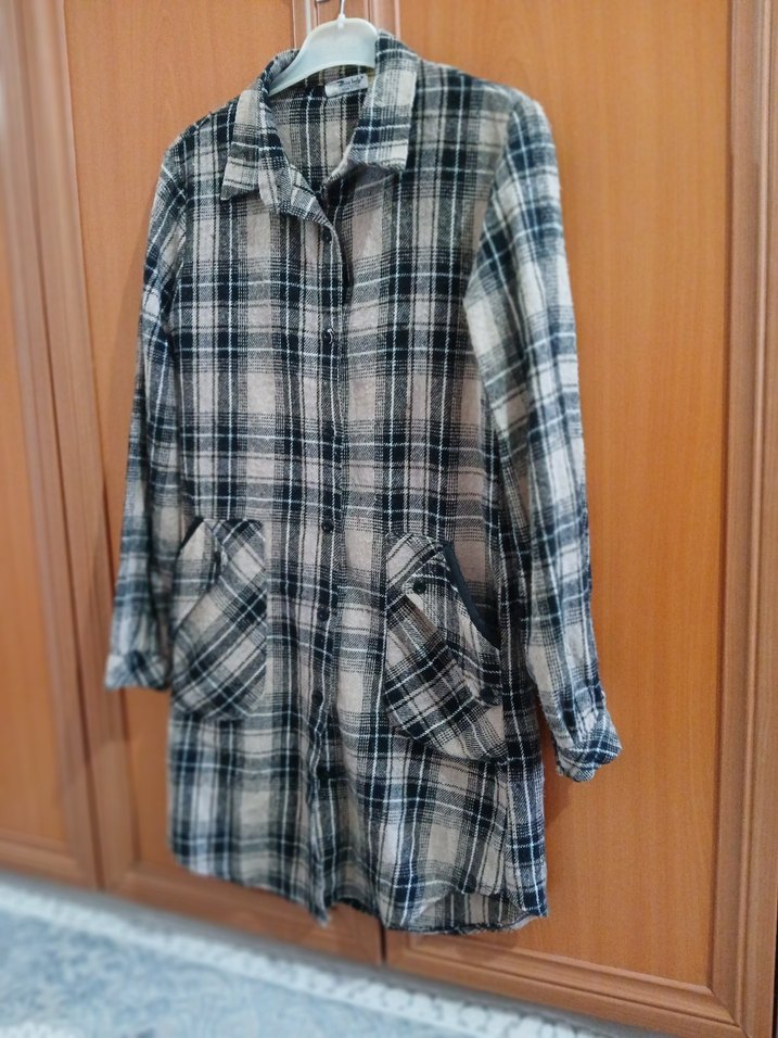 Gri ekoseli keten gömlek, yakalı, düğmeli ve uzun kolludur. Salaş kesimi ve midi boyuyla rahat sokak stiline uygundur. İki ön cepli.