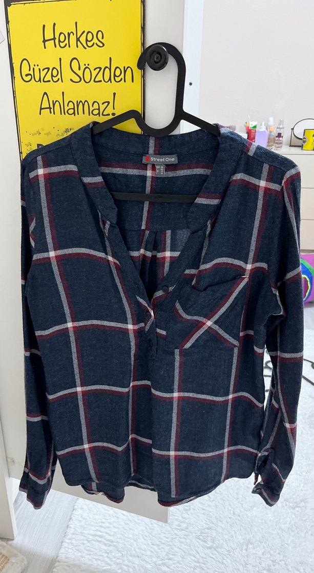 Pamuk kumaştan, düğmeli ön ve V yaka detaylı, bol kesim uzun kollu gri ekoseli kadın gömlek. Günlük rahat sokak stili için uygundur.