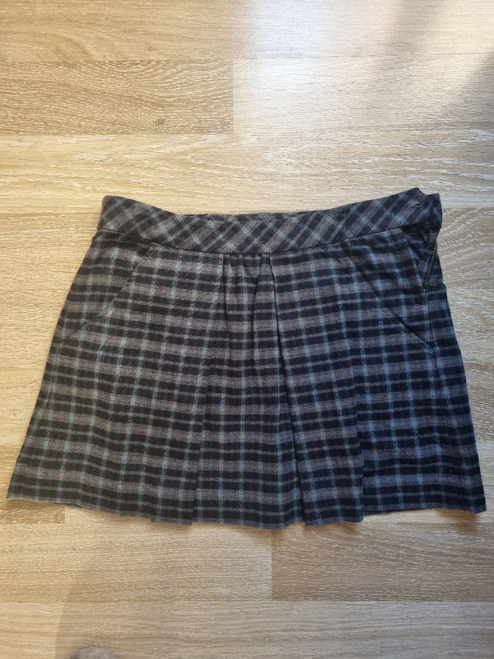 mavi-gri renkli, pilili ve ekoseli mini etek, günlük sokak stiline uygundur.