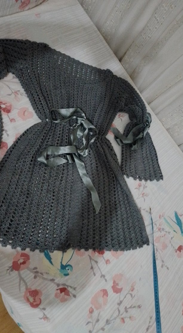 Gri triko hamile hırka, salaş kesim, kayık yaka ve askılı kollara sahiptir. Midi boyda olup, şık bir kurdele kemer içerir. Rahat ve bohem tarz için uygundur.