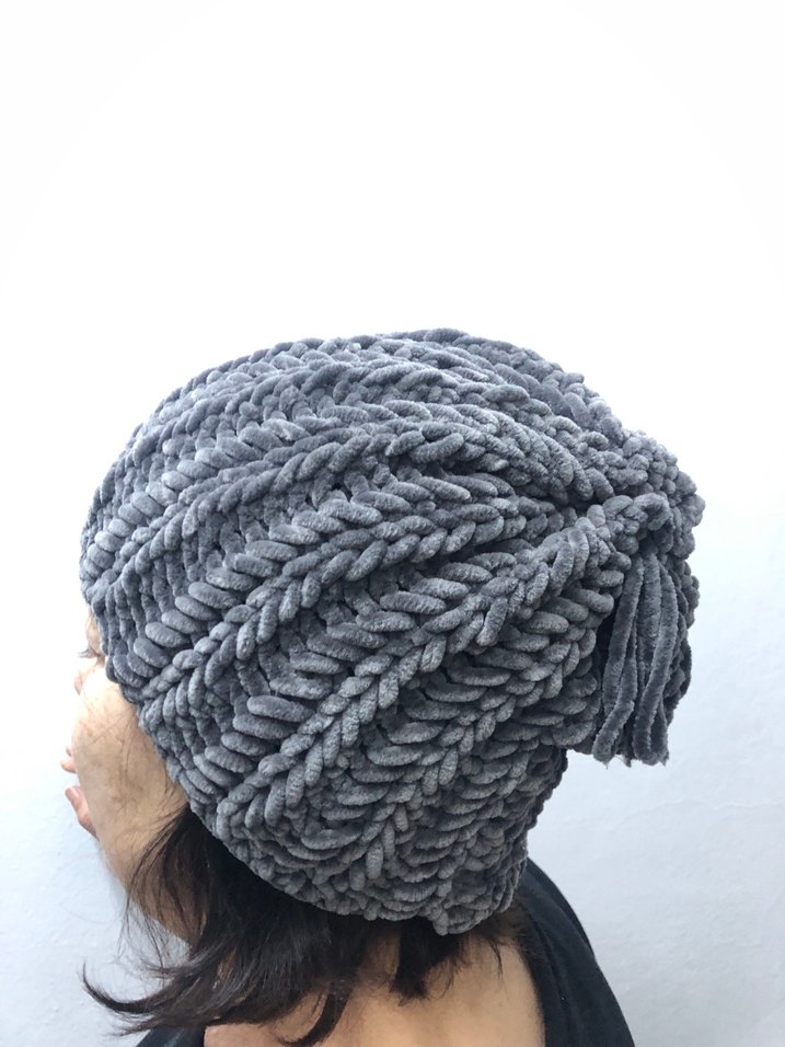 Gri renkli, örgü dokulu, bohem tarzında rahat ve sade kadın erkek bere.