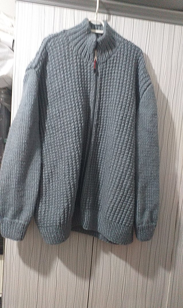Gri örgü erkek hırka, yüksek yakalı ve uzun kolludur. Bol kesim ve normal boyda, günlük kullanıma uygundur biraz örgü olduğu için ağırdır ama .tipide soğukta sıcak tutar el emeği göz nurudur