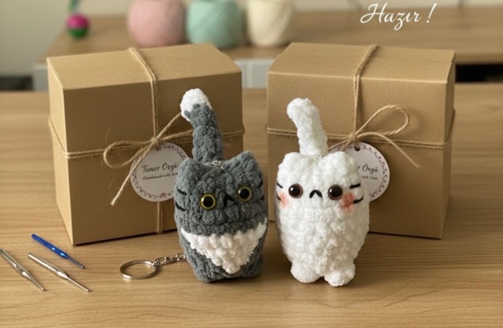 El yapımı gri örgü kedi anahtarlık, detaylı gözler ve kuyruk ile. Kedi severler için uygun. İstenilen renkte tasarlanır .