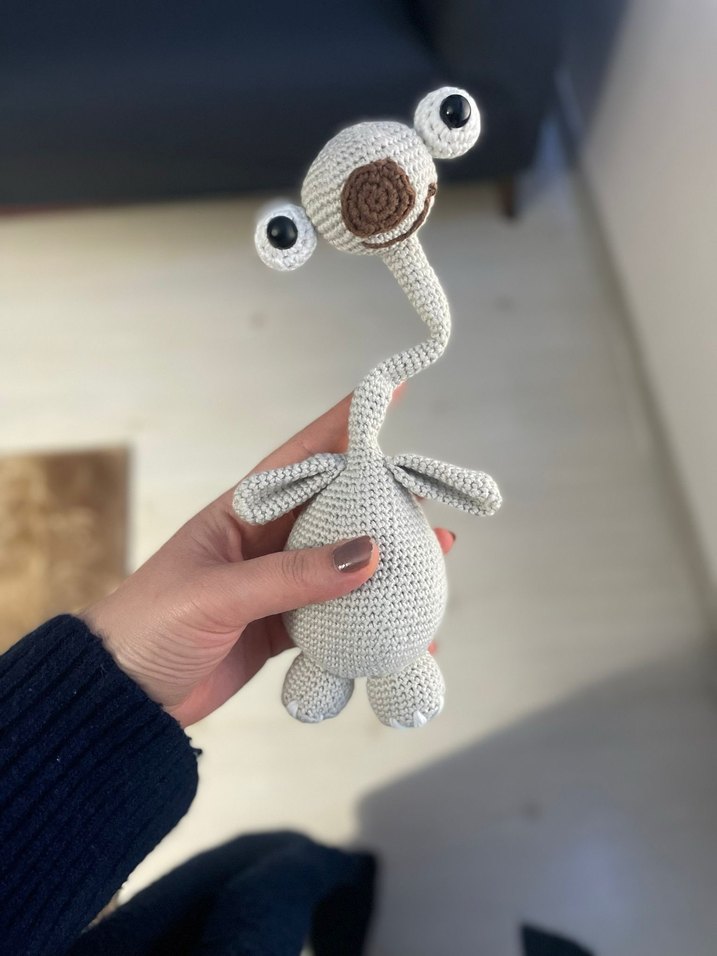 Büyük gözlü ve uzun boyunlu gri el örgüsü peluş oyuncak, yumuşak ve hafif dokusuyla dikkat çekiyor.