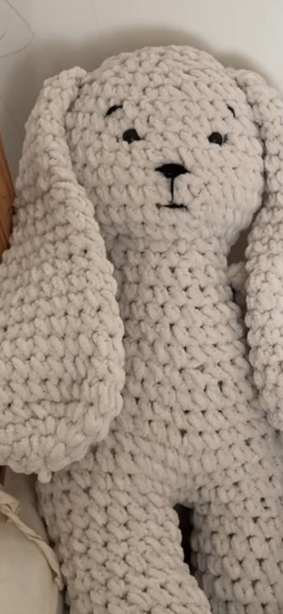 Yumuşak gri el örgüsü peluş tavşan, uzun kulaklı ve detaylı yüz ifadelerine sahip oyuncak istenilen renkte örülür