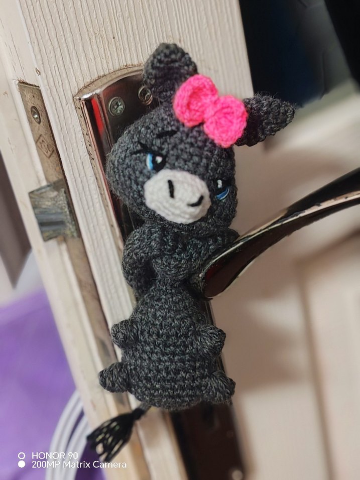 Mavi gözlü ve pembe kurdeleli gri el örgüsü sevimli peluş oyuncak, ortama şirinlik katar. Adet fiyatı dır