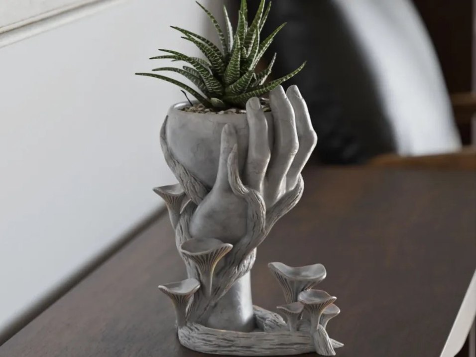 Gri renkte, mantar detaylı ve el figürlü saksı. Küçük bitkiler için özel tasarım, ev dekorasyonuna sanatsal bir dokunuş katar.