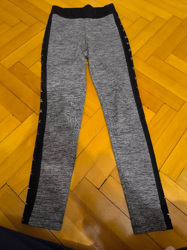 Elastik bel bandına sahip, normal midi boyda, gri renkli, siyah yan şeritlerde yıldız desenli, sentetik kumaştan üretilmiş kadın spor taytıdır. ⭐